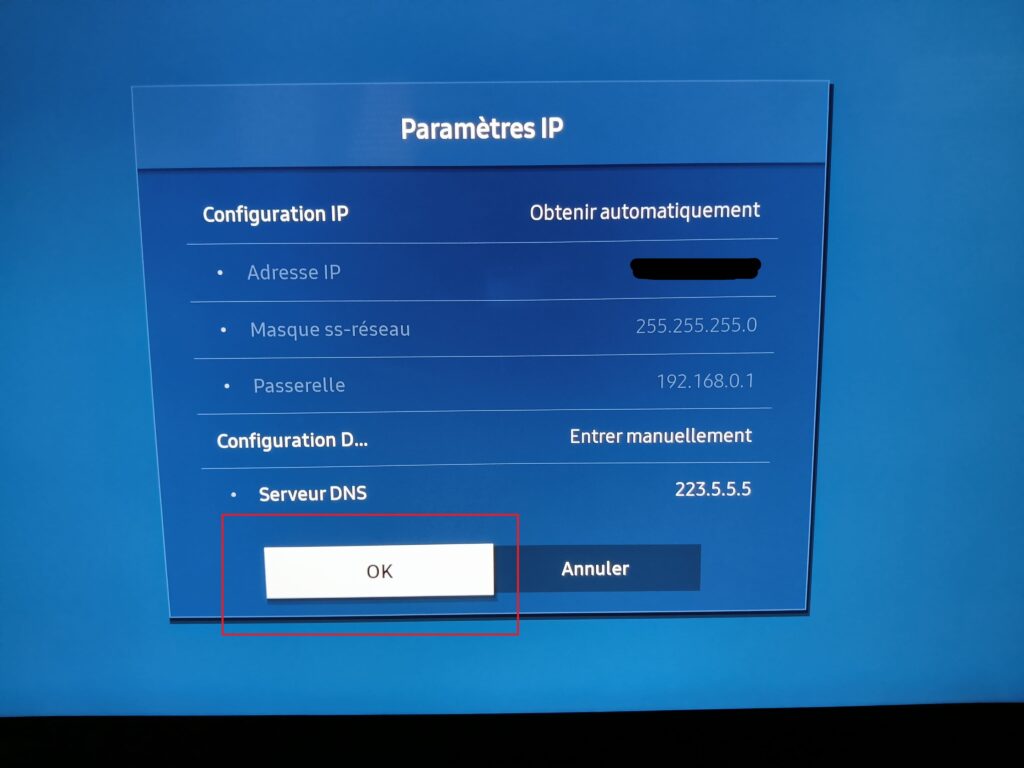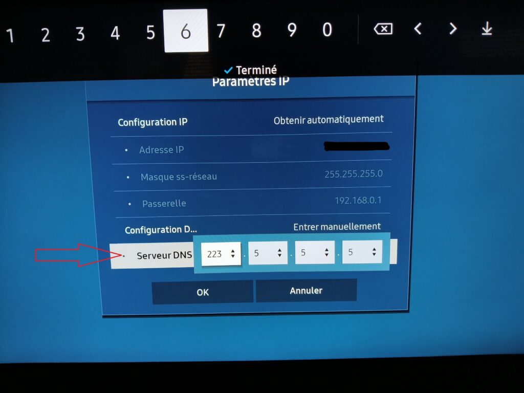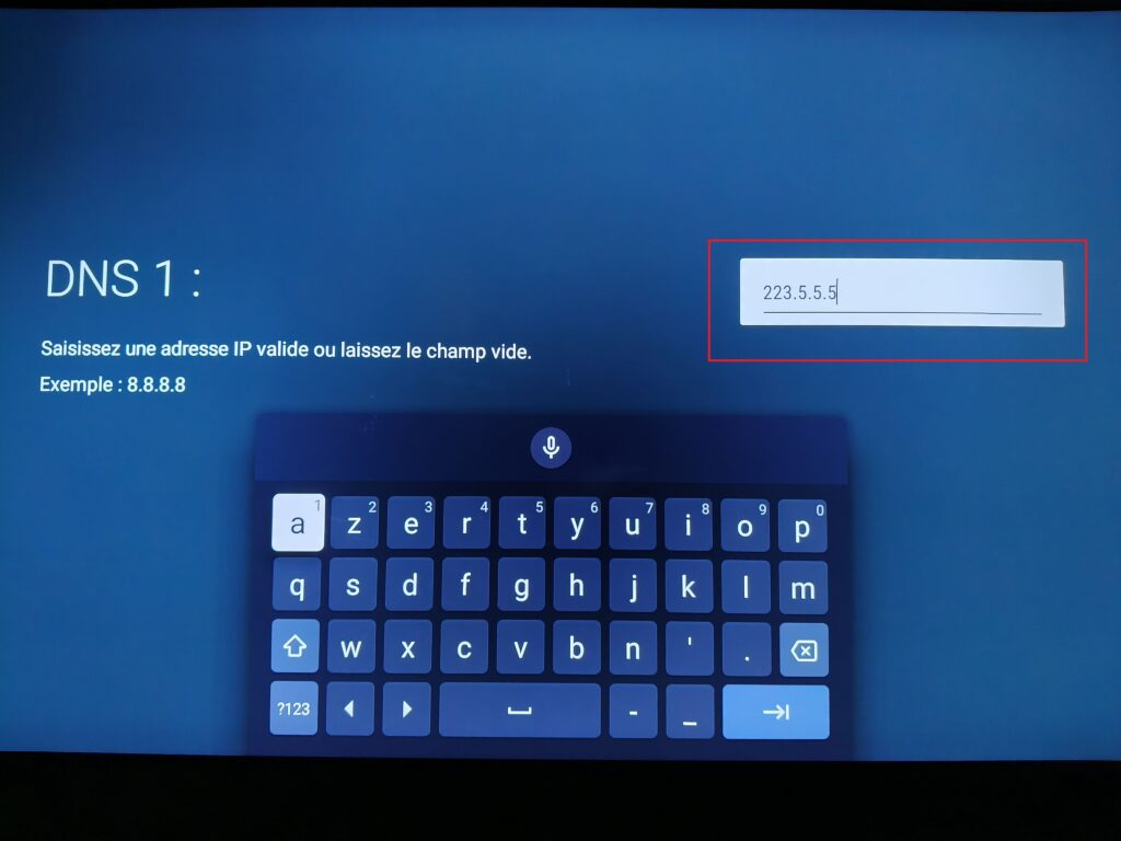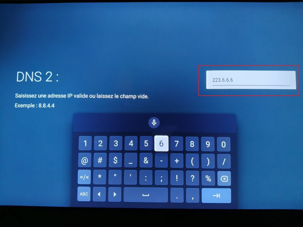 – Vous etes redirigé vers DNS 1 mettez 223.5.5.5 et appuyez sur OK pour passer au DNS 2 et introduisez 223.6.6.6 et vous finissez par valider
