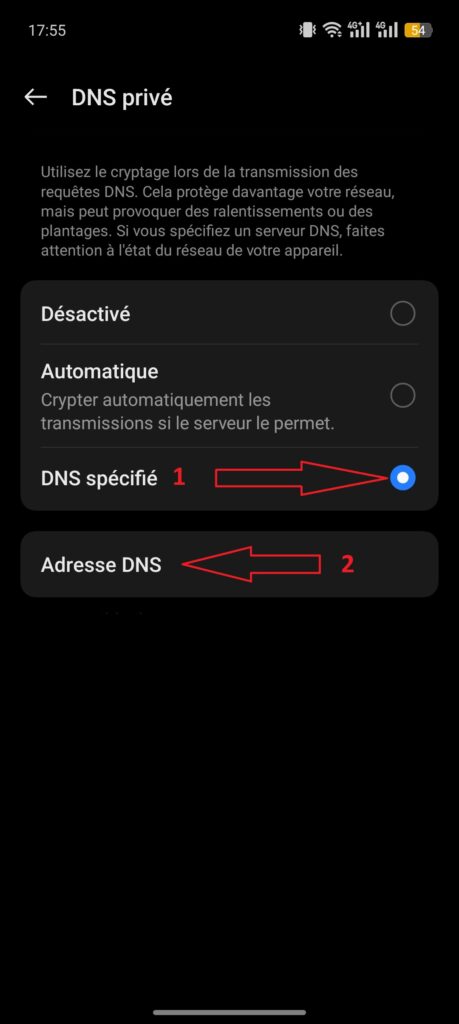 – Basculez de Automatique vers DNS spécifié et cliquez sur Adresse DNS