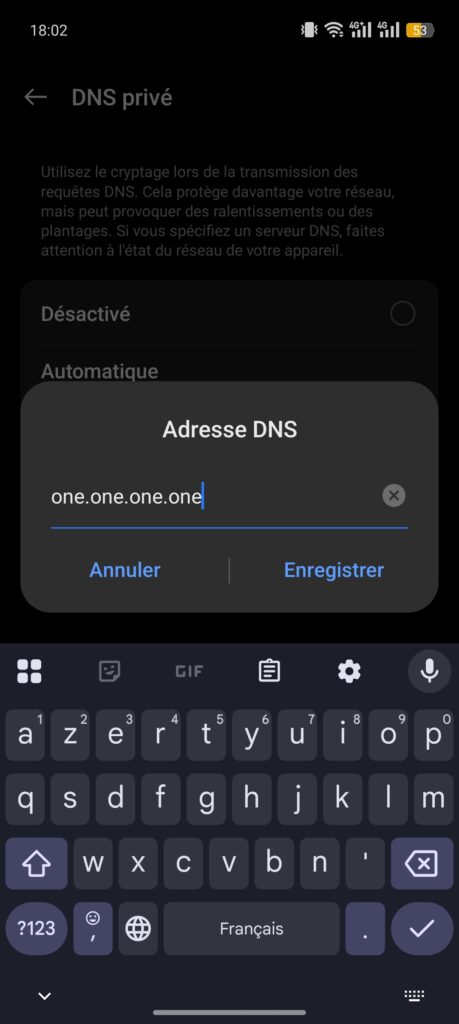 – Mettez le DNS suivant tout en lettres comme démontré sur la photo: one.one.one.one