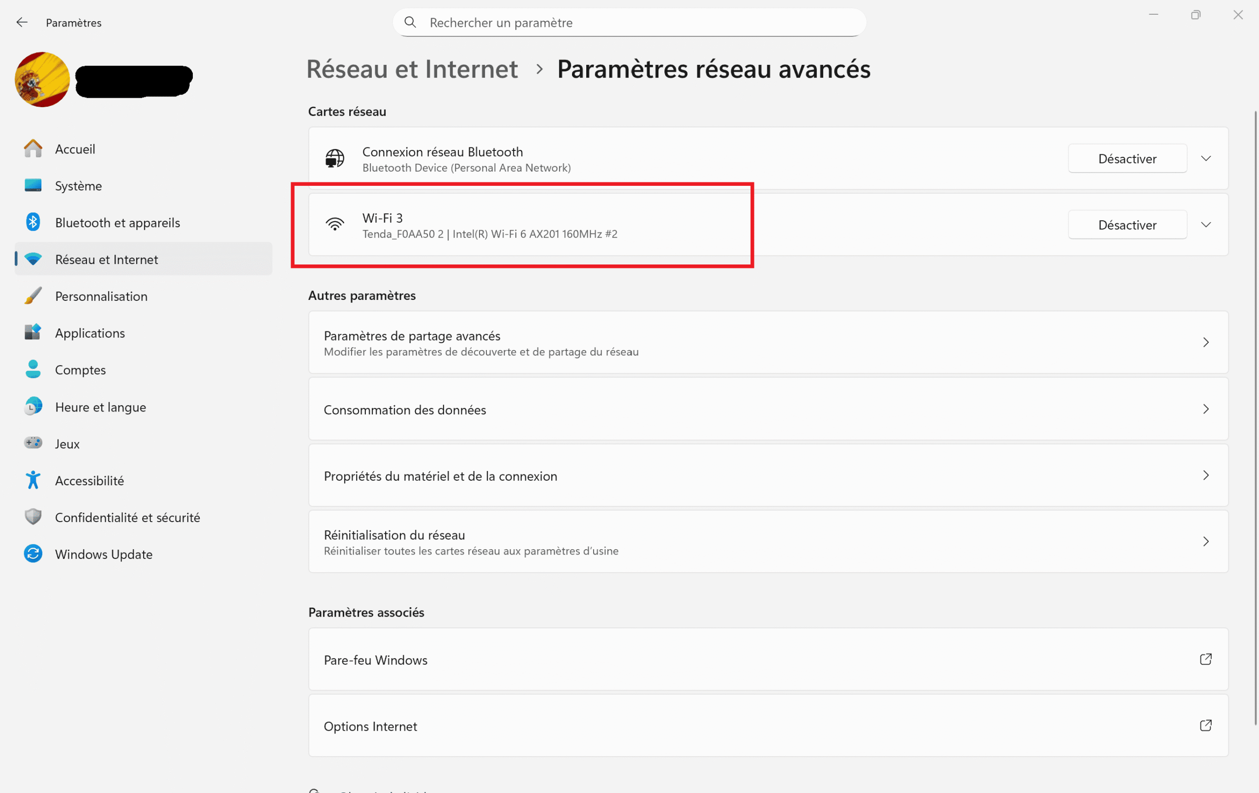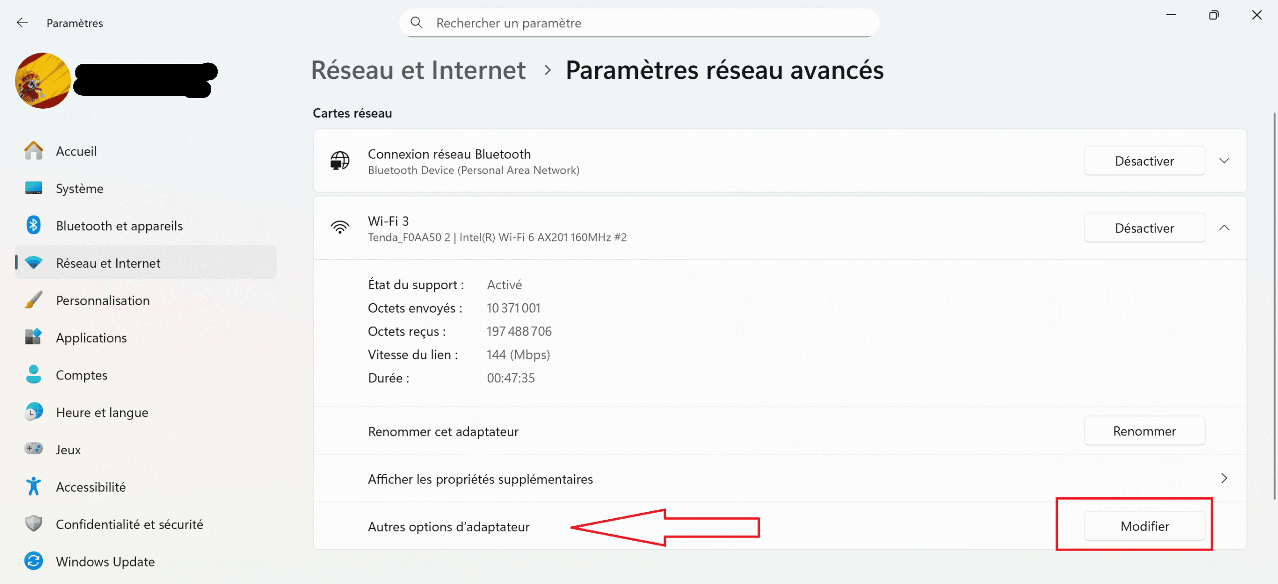 – Cliquez sur la carte réseau de votre Wifi, ensuite sur modifier dans Autres options d’adaptateur
