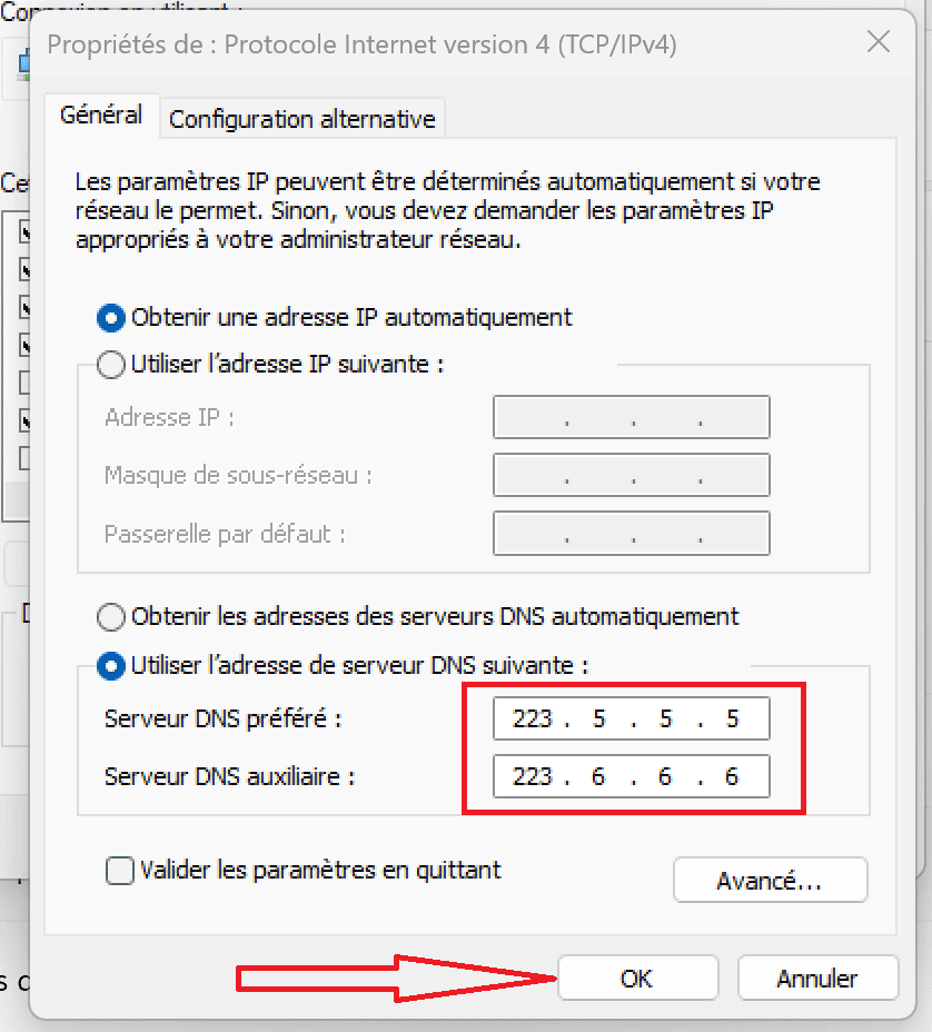 – Sélectionnez “Utiliser l’adresse de serveur DNS suivante” et mettez les 2 DNS suivants comme démontré dans la photo